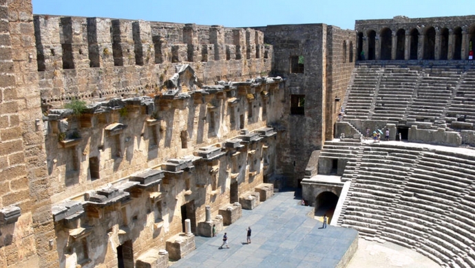 Аспендос характеризуется как один из лучших древних театров, который очаровывает туристов и посетителей со всего мира и вмещает от 15 000 до 20 000 зрителей.