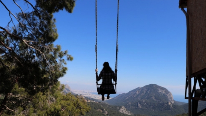 В прибрежном пейзаже гор Таурус в Анталии местные и иностранные посетители могут покататься на качеле на свежем воздухе.